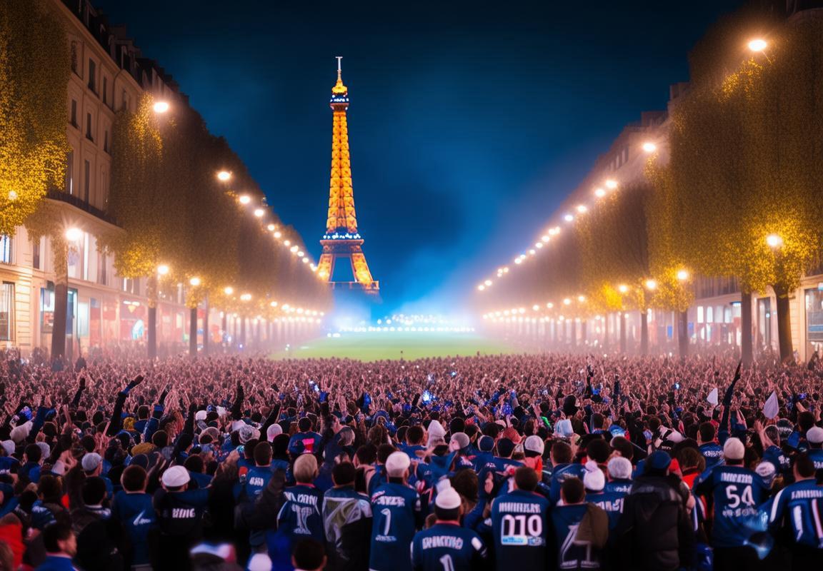 2. 在巴黎的香榭丽舍大街上,球迷们身着各自球队的标志性球衣,手持旗帜和标语,形成了一道独特的风景线。夜幕降临,埃菲尔铁塔的灯光在夜色中闪烁,仿佛在为这场盛事增添一份神秘与庄严。